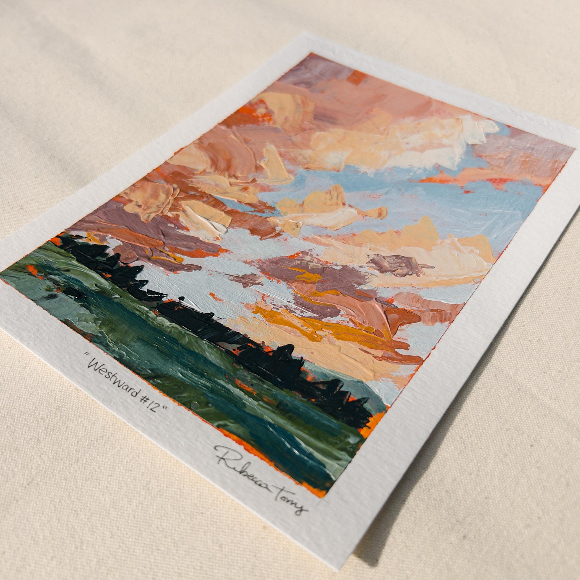 This mini was painted with archival quality, light-fast acrylics on 185 lb. cold pressed paper. Each artwork measures 5x7" with an additional 1/2" border for easy matting and framing. The title, Rebecca's signature, and 1 / 1 (showing this will never be duplicated or reproduced) are handwritten along the bottom edge.