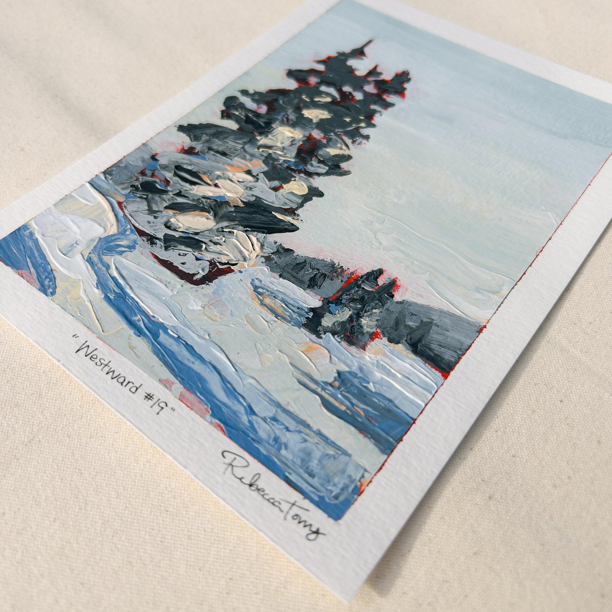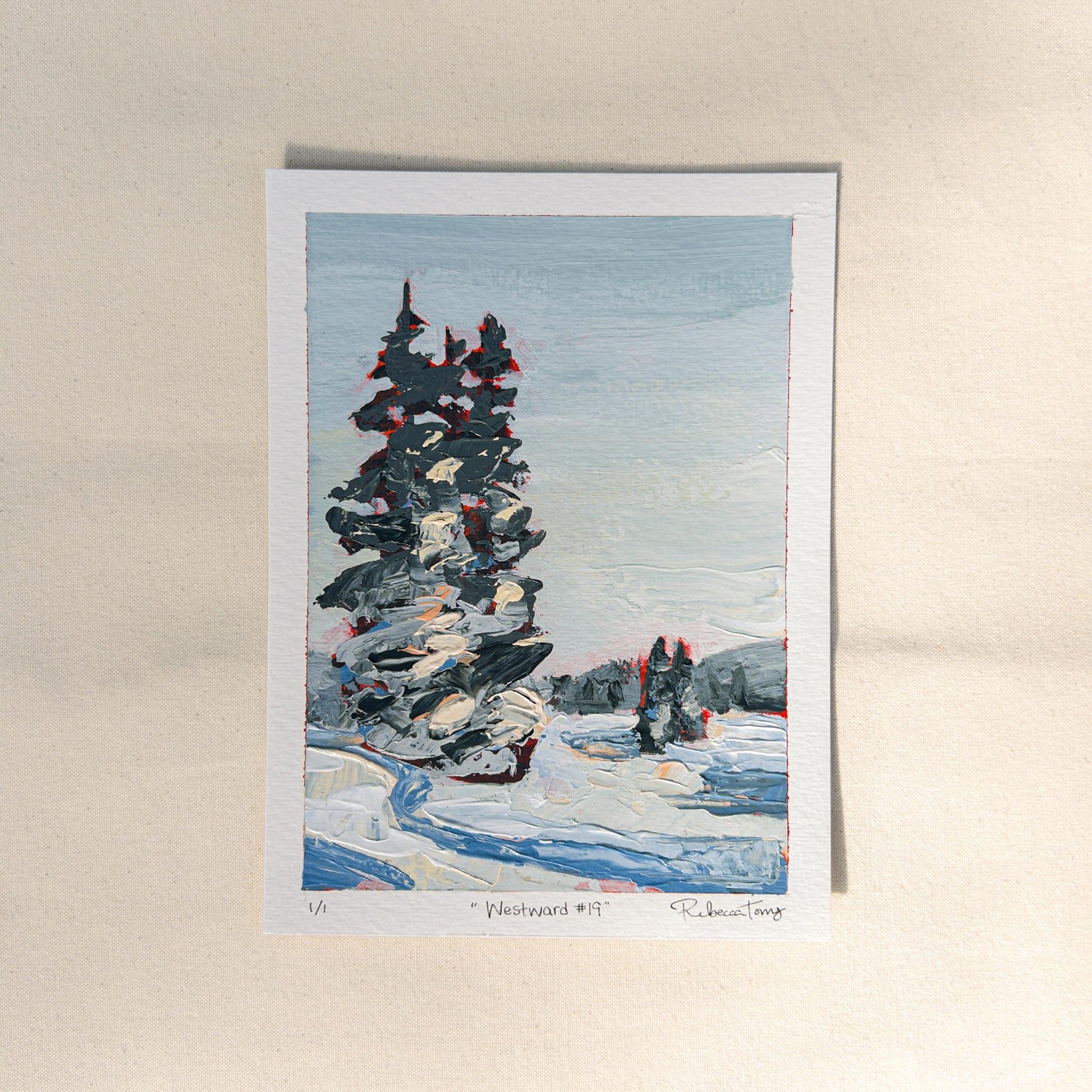 This mini was painted with archival quality, light-fast acrylics on 185 lb. cold pressed paper. Each artwork measures 5x7" with an additional 1/2" border for easy matting and framing. The title, Rebecca's signature, and 1 / 1 (showing this will never be duplicated or reproduced) are handwritten along the bottom edge.