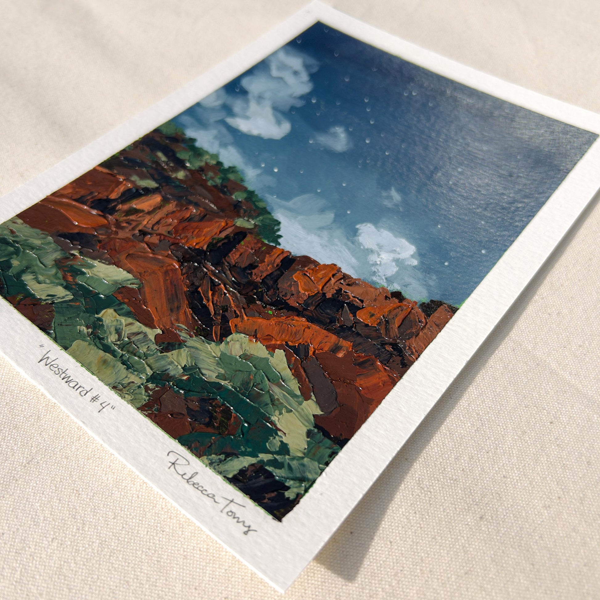 This mini was painted with archival quality, light-fast acrylics on 185 lb. cold pressed paper. Each artwork measures 5x7" with an additional 1/2" border for easy matting and framing. The title, Rebecca's signature, and 1 / 1 (showing this will never be duplicated or reproduced) are handwritten along the bottom edge.